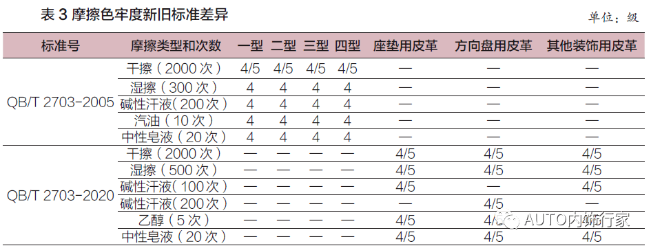 旧标准4 种类型皮革的耐磨次数都是500 转,新标准增加了耐磨次数,座垫用皮革的耐磨次数是1000 转,方向盘皮革的耐磨次数是2000 转,其他装饰用皮革暂不考虑耐磨性。